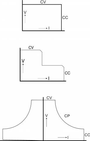 Constant power output ranges feature a curved power contour. A power supply with constant power output can deliver full rated power across a wide voltage range — from maximum voltage down to minimum — by increasing current accordingly as voltage decreases, up to the current limit.